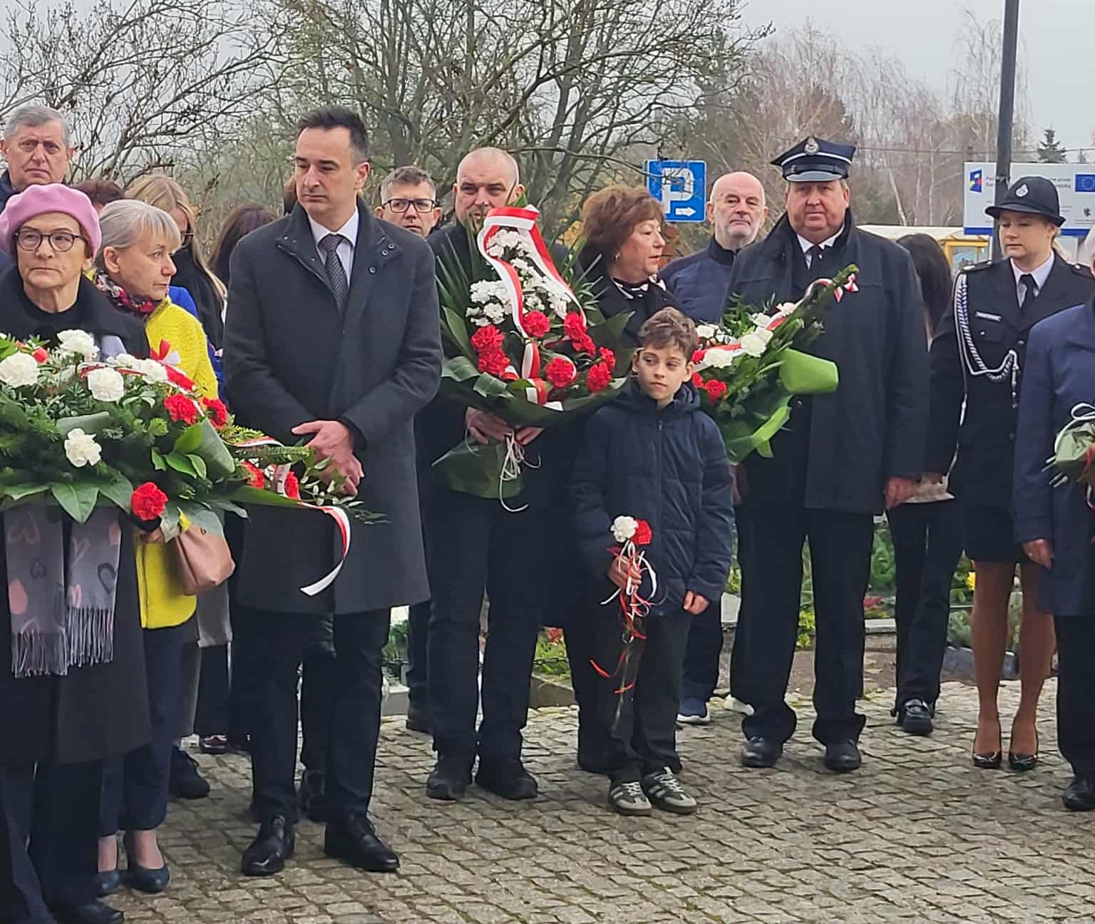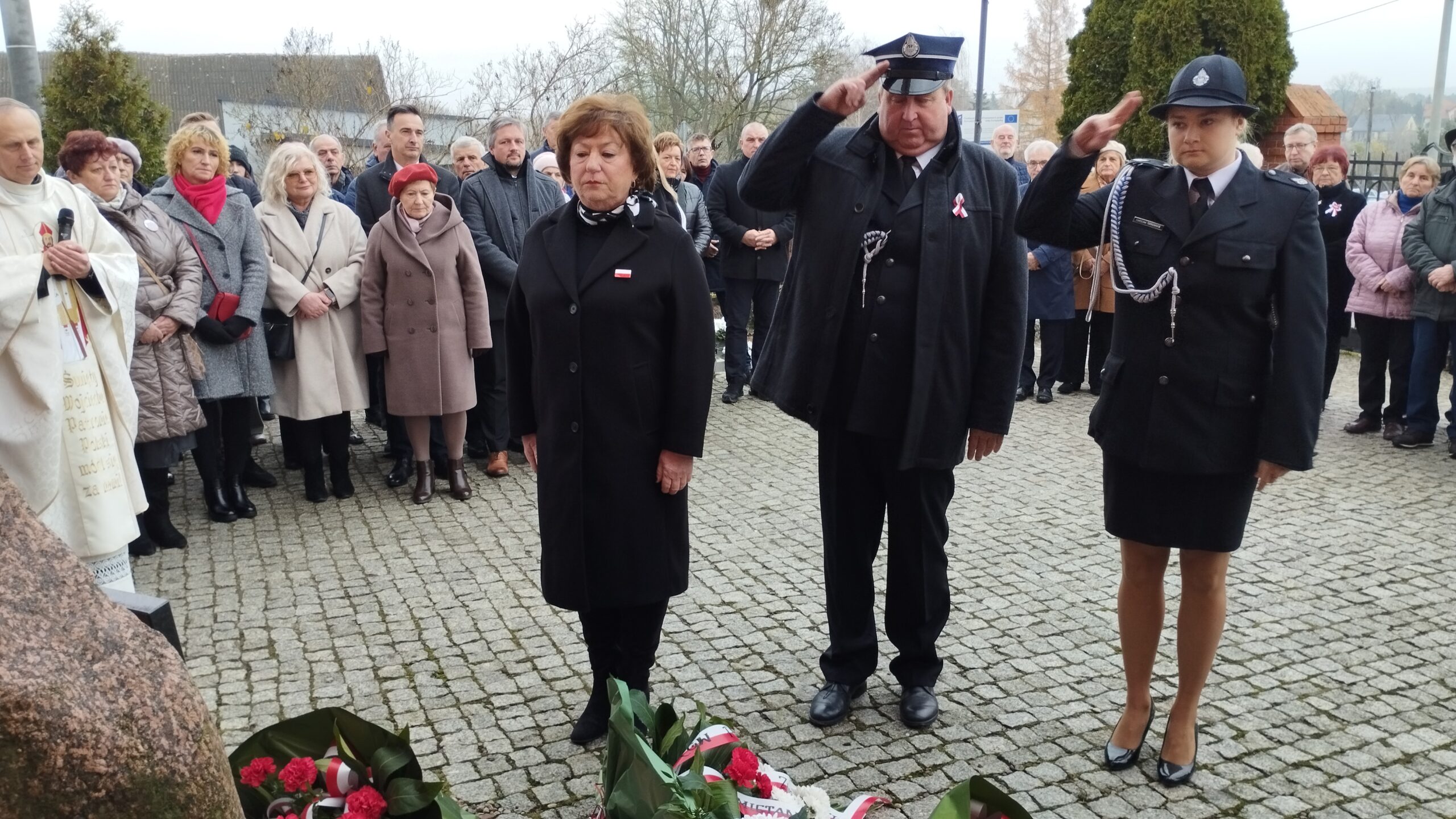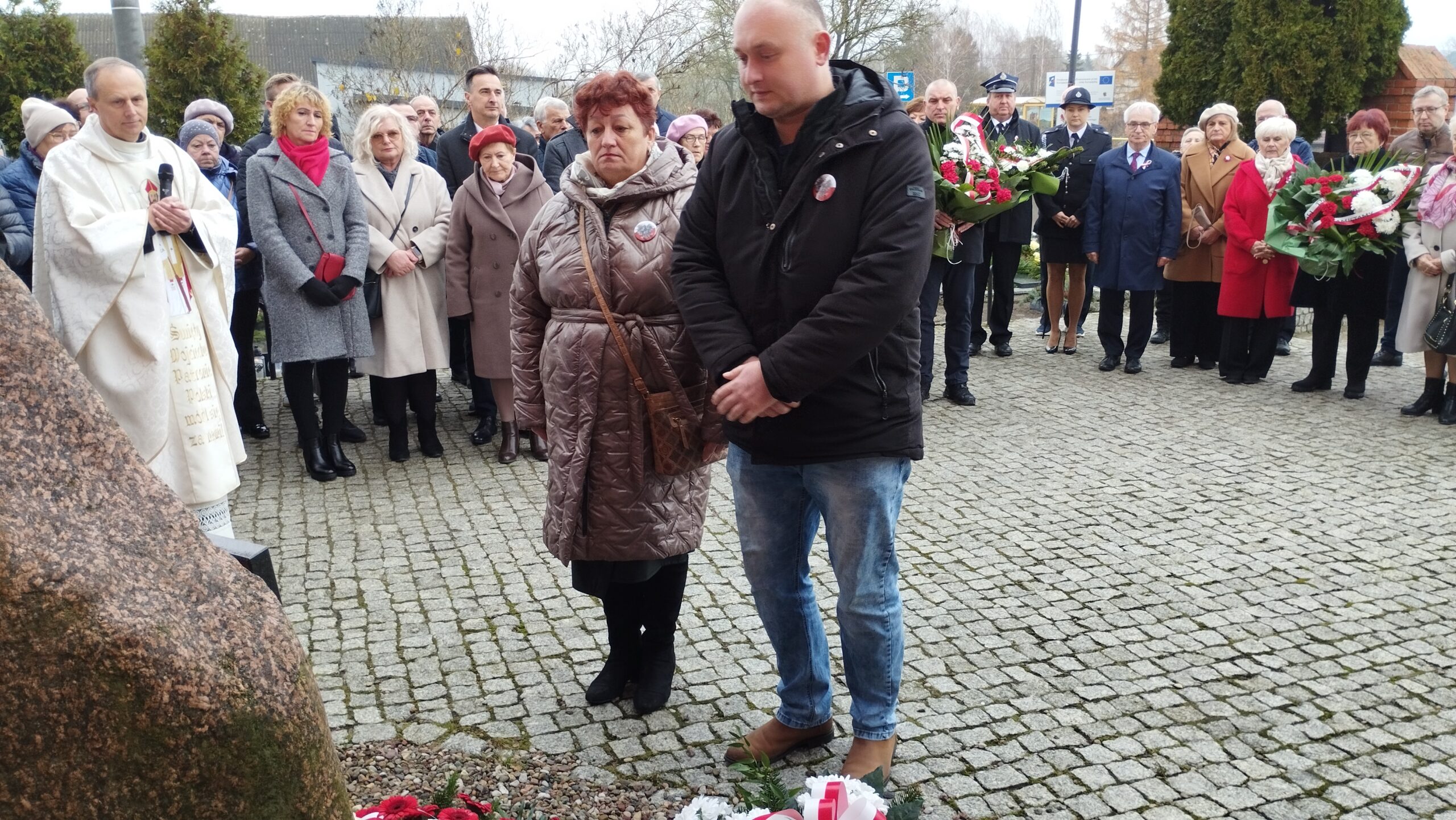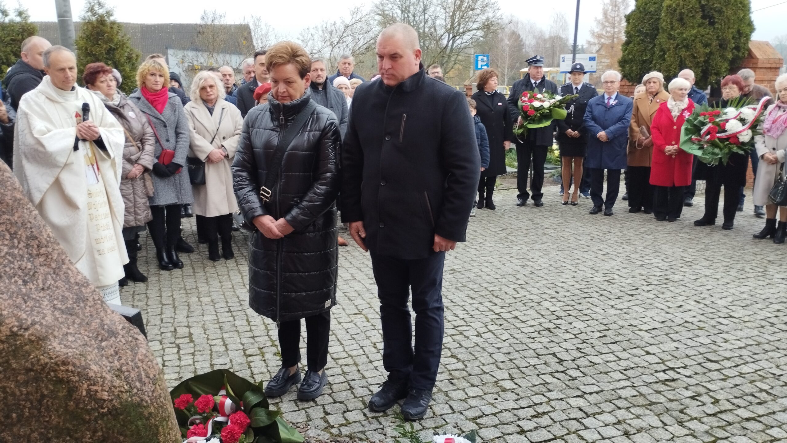 pamiątkowe wiązanki kwiatów. Kwiaty złożyli Strażacy OSP w Złotoirii; przedstawiciele